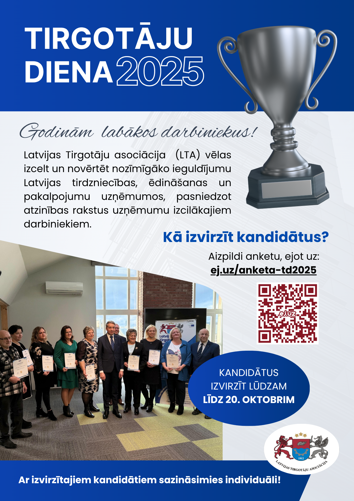 | Latvijas Tirgotāju asociācija aicina izvirzīt kandidātus Tirgotāju dienai 2025! Tirgotāju asociācija (LTA) arī šogad turpina tradīciju svinēt Tirgotāju dienu un pasniegt atzinības rakstus Latvijas tirdzniecības, ēdināšanas un pakalpojumu uzņēmumu labākajiem darbiniekiem. Izvirziet kandidātus tādās kategorijās kā: Veikala vadītāji, zāles vadītāji, maiņas vadītāji, sabiedrisko attiecību speciālisti, mārketinga speciālisti, kasieri, bārmeņi, pavāri, grāmatveži, finansisti u.c. Kā izvirzīt kandidātus? Lai pieteiktu kandidātu, līdz 20. oktobrim jāaizpilda pieteikuma anketa, kura pieejama: ŠEIT Pasākuma noslēgums paredzēts 2025. gada 23. oktobrī plkst. 15.30. Informāciju, par norises vietu, tuvākajā laikā precizēsim, un publicēsim LTA mājaslapā un LTA facebook lapā. Ar izvirzītajiem kandidātiem sazināsimies individuāli. |