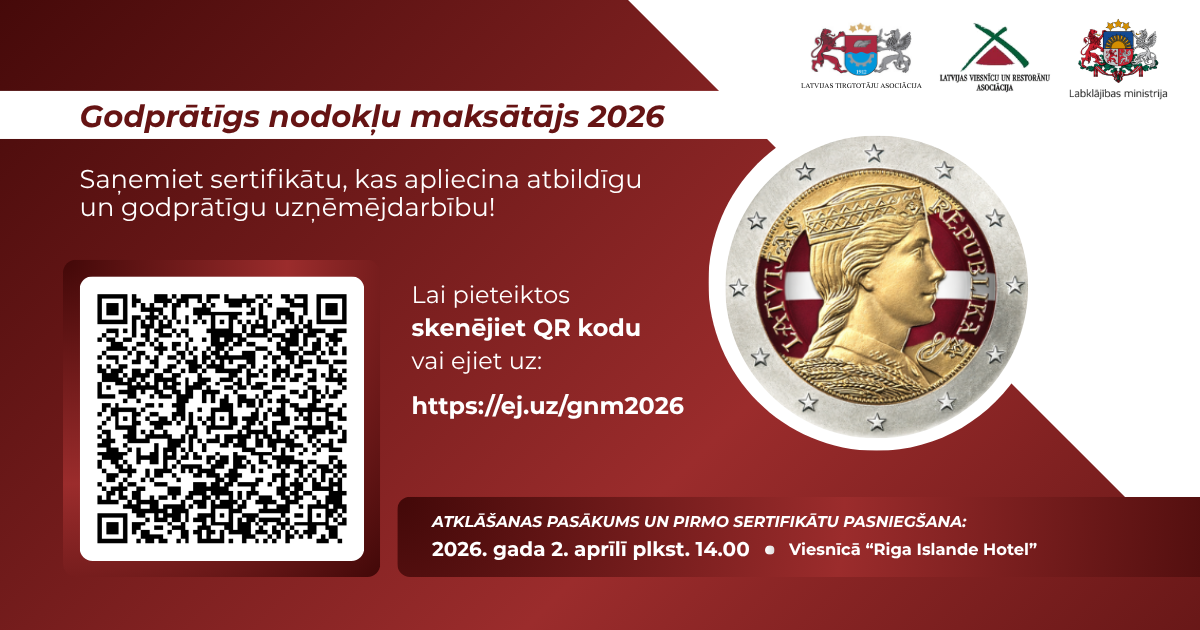 Aicinām pieteikties nominācijai “Godprātīgs nodokļu maksātājs 2026”, kuras mērķis ir izcelt uzņēmumus un organizācijas, kas demonstrē atbildību un godprātību nodokļu saistību izpildē.